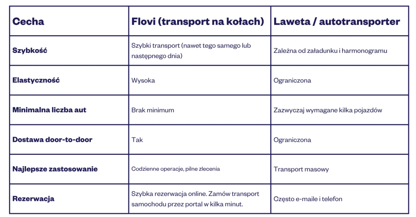 Transport samochodów lawetą jest zoptymalizowany pod kątem logistyki masowej i przewozu wielu pojazdów jednocześnie. Jest to rozwiązanie efektywne przy dużych wolumenach, jednak wiąże się z określonymi ograniczeniami: koniecznością oczekiwania na pełny załadunek, sztywnymi harmonogramami oraz niską elastycznością operacyjną.