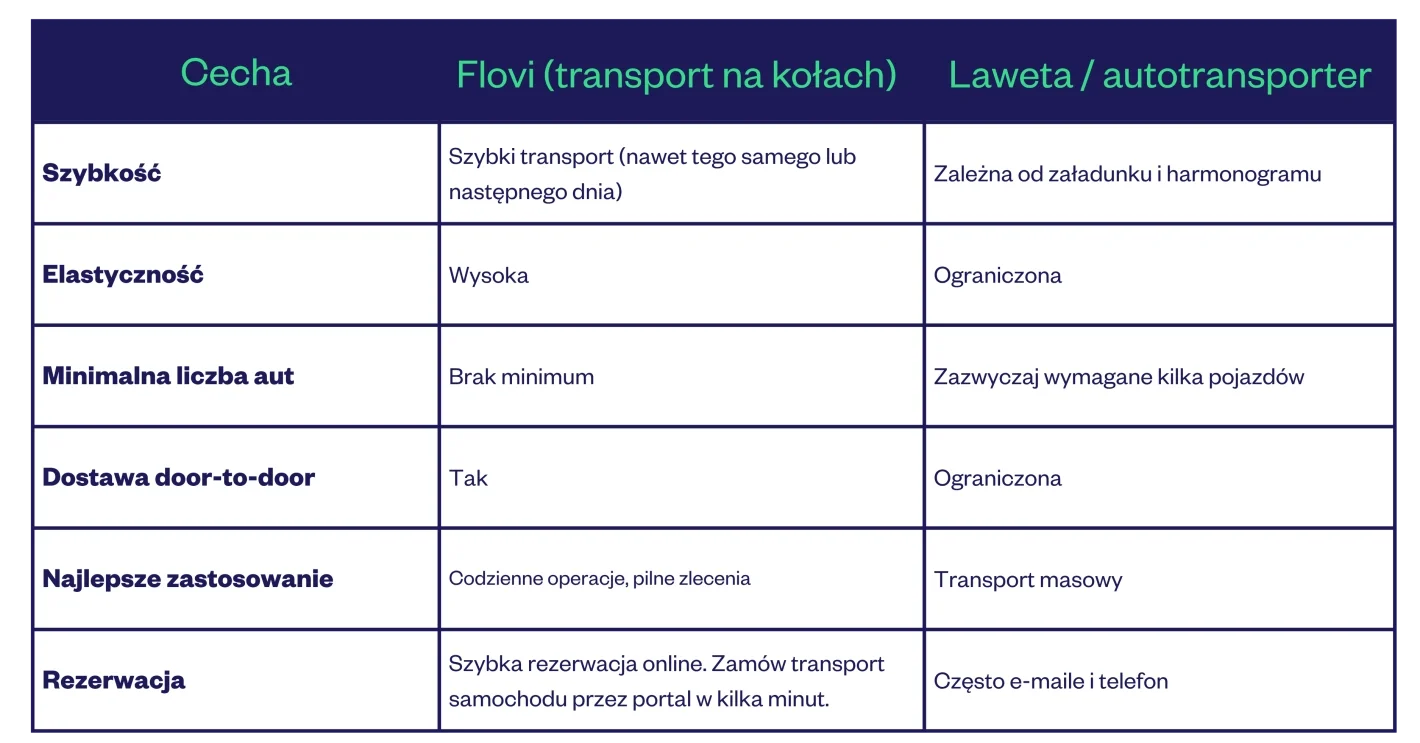 Transport auta na kołach stanowi efektywniejszą alternatywę w sytuacjach, gdy priorytetem jest czas realizacji i dyspozycyjność. W modelu Flovi wykwalifikowany kierowca odbiera pojazd i dostarcza go bezpośrednio do punktu docelowego, bez zbędnych postojów pośrednich. Pozwala to na znaczące przyspieszenie procesów logistycznych, szczególnie w przypadku transportu pojedynczych aut lub zleceń o wysokim priorytecie czasowym.